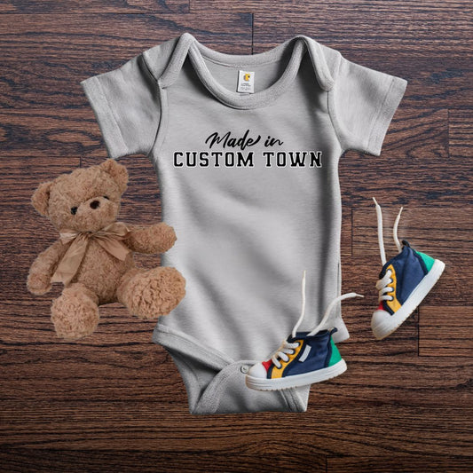 TINY TOWNIES– a sweet celebration of hometown joy! Explore our 'Made in [Town]' onesies and more, designed to wrap your little one in local love. Perfect for both locals and those looking for an adorable gift with hometown flair. Shop now and share the pride!