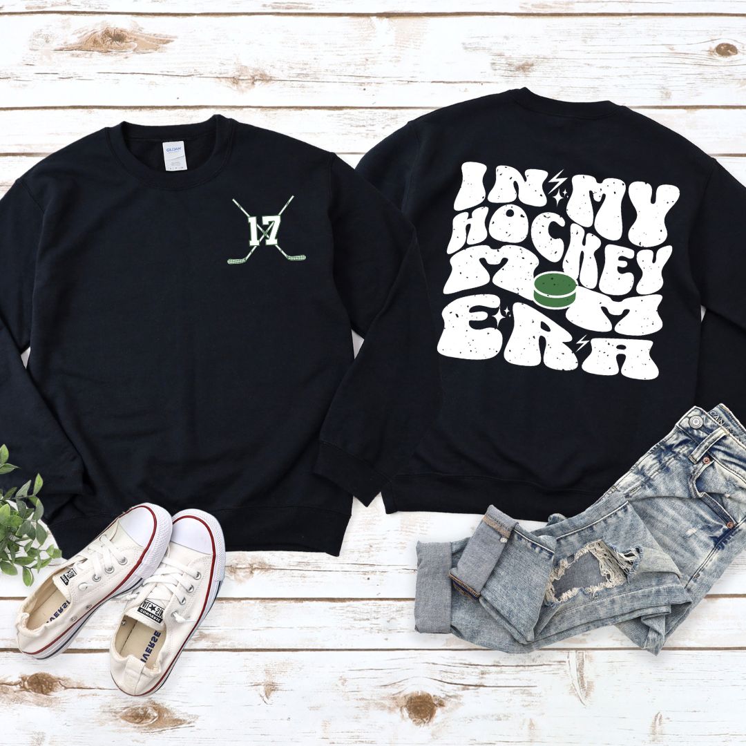 Show your support at the rink with our "In My Hockey Mom Era" cozy crew. These sweatshirts are personalized with your player's last name or hockey number on the front pocket corner.