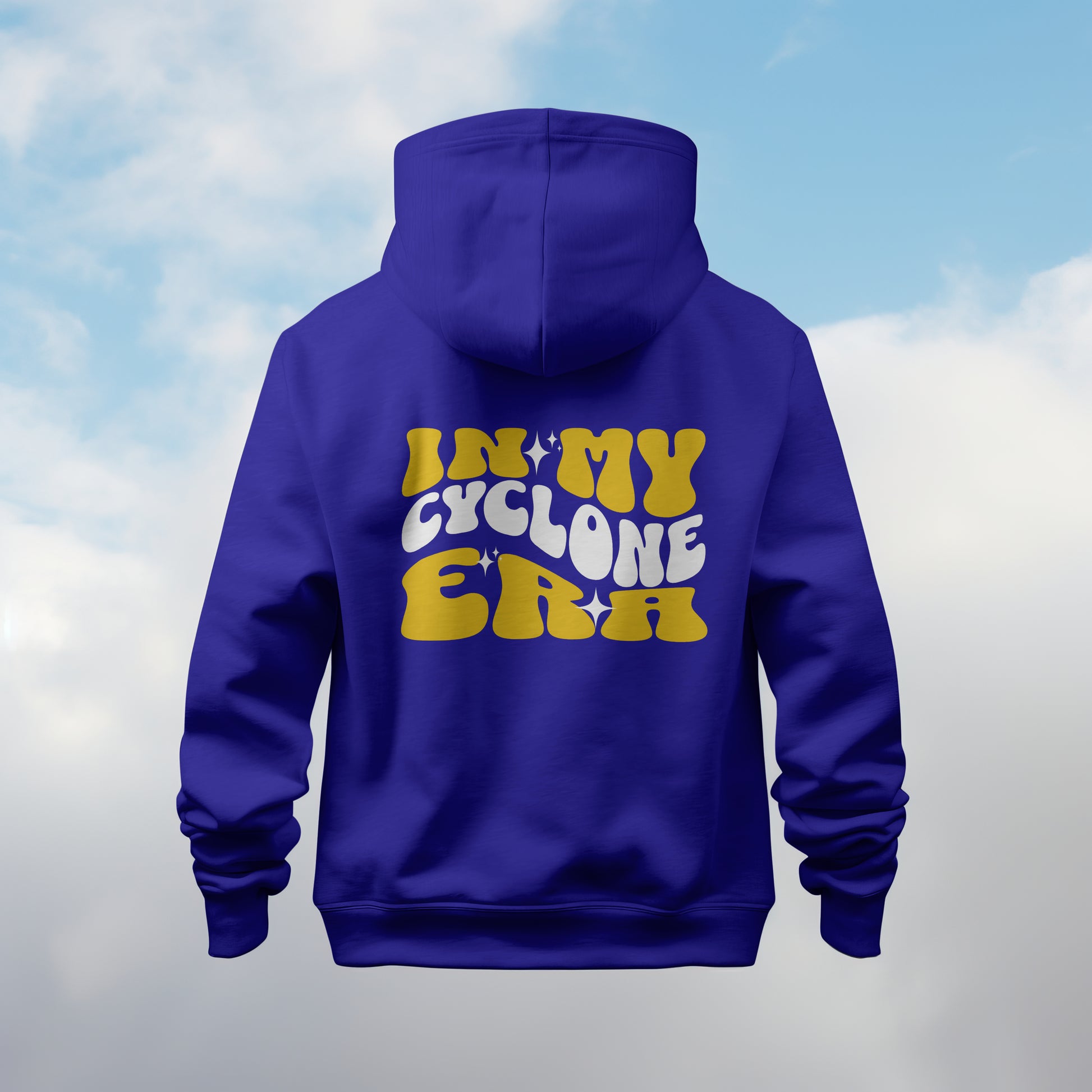 Zip up navy blue hoodie featuring Malden Cyclones on the front pocket with "In My Cyclone Era" on the back.