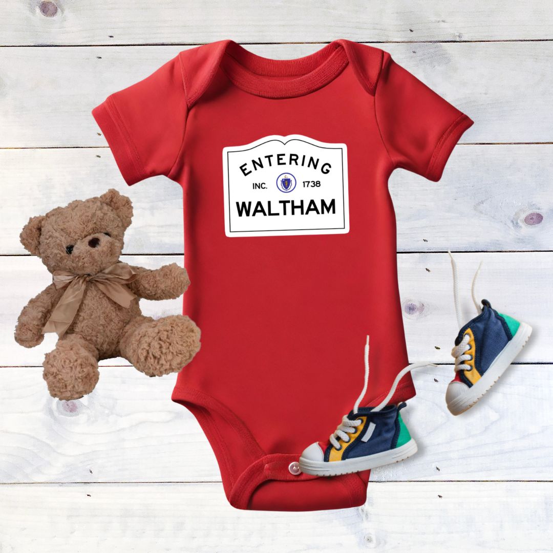 Entering Waltham baby onesie. Available in sizes newborn and up, this cute onesie proudly displays your little one's origins. A must-have for any proud parent or gift for a friend! This is the perfect onesie for any Waltham newborn to wear home from the hospital!