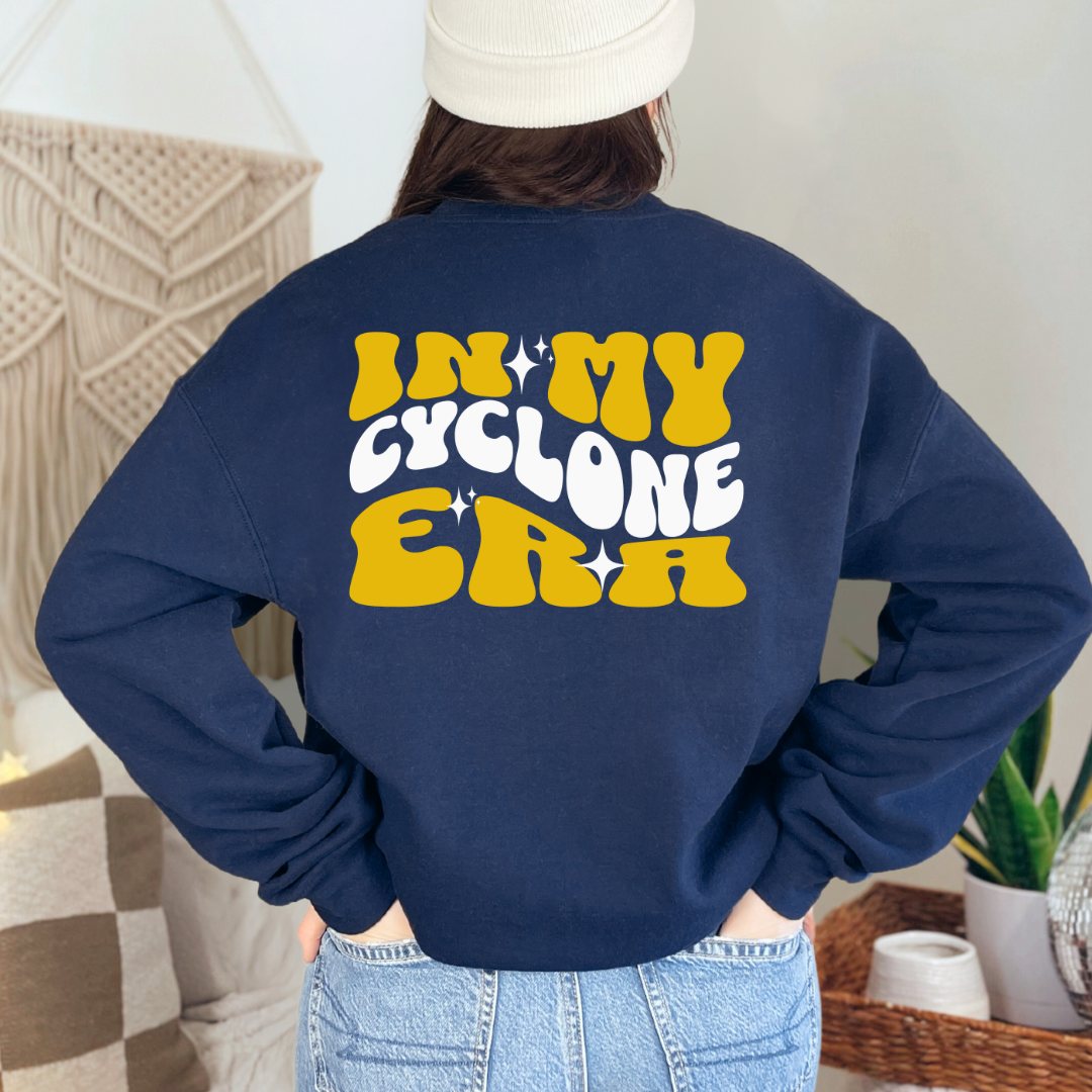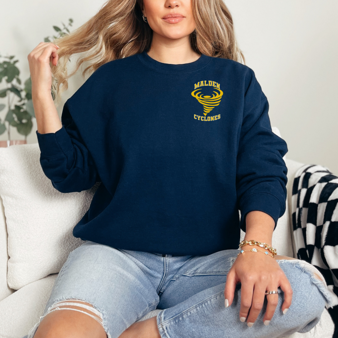 Gildan cotton crewneck featuring Malden Cyclones on the front pocket with "In My Cyclone Era" on the back.