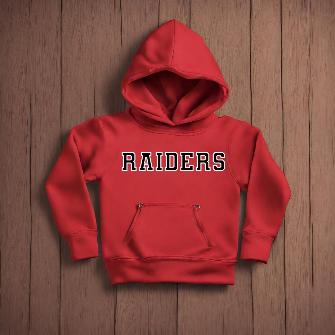 Cheer on your favorite Raider in our simple and cozy Raider Hoodie. Fully customizable to add a player's name or number to the sleeve to show your pride. Available in sizes toddler to adults so the whole family can show their spirit in the bleachers or in the stands!